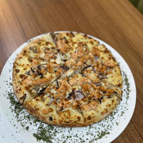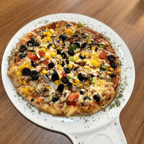 Kip, paprika, champignons, ui, olijven, maïs, tomaat.